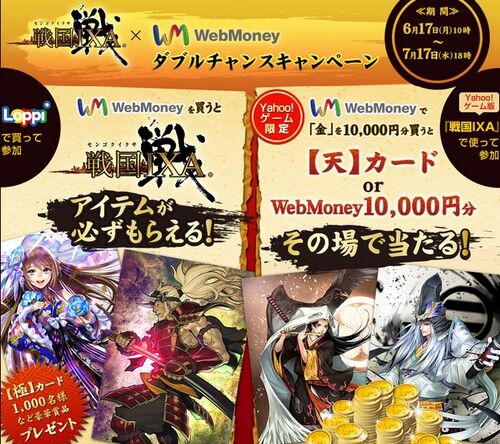 合戦お疲れ様でした♪ 6/17(月)~ 「戦国IXA×WebMoney ダブルチャンスキャンペーン」というのが始まりましたが、皆さんご存知でしたか? 私は今日友人からその話を聞いて知りました^^; WebMoneyの購入で極・特カードやチケがもらえ、さらにWebMoneyで金…